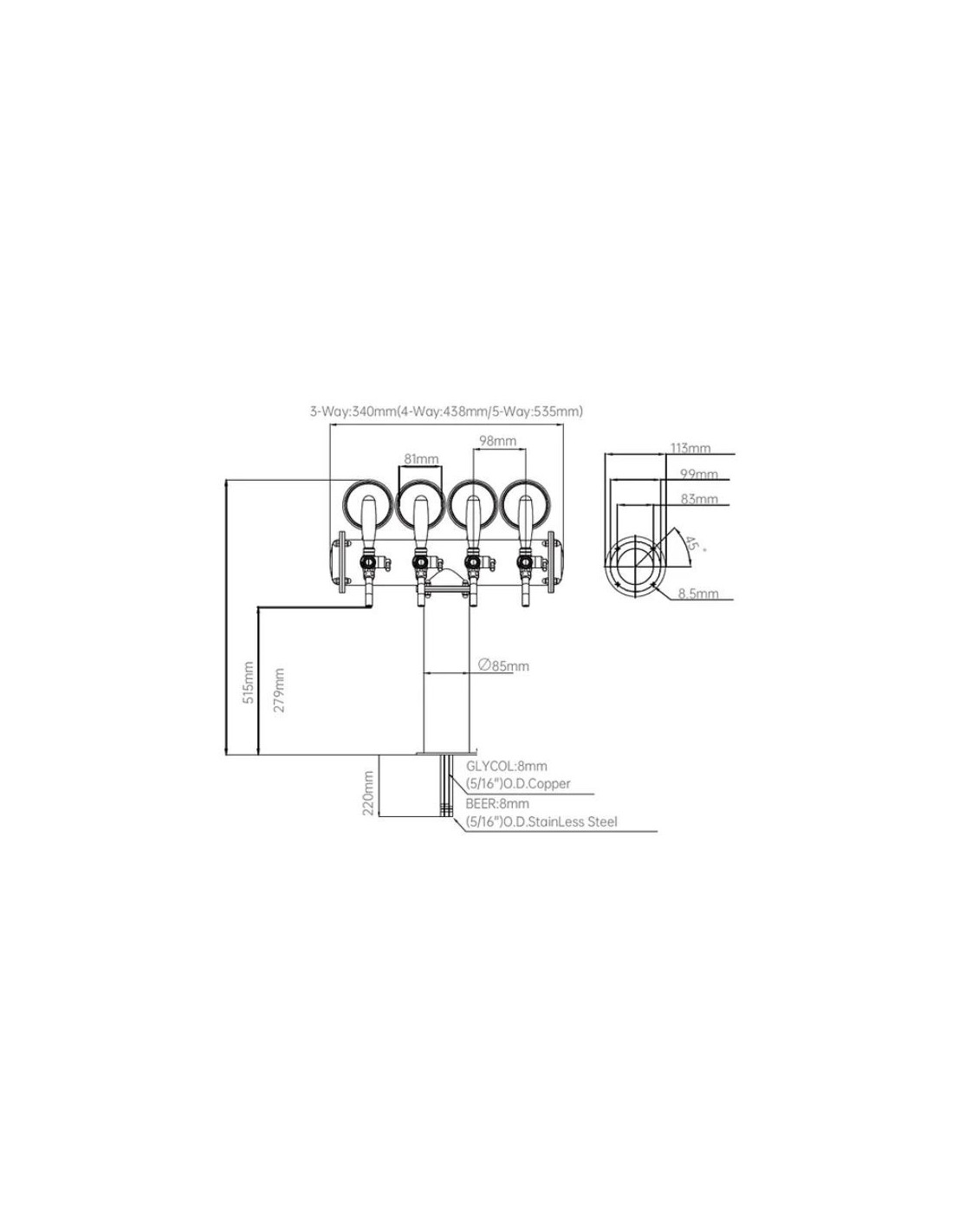 Esta torre dispensadora de cuatro salidas en forma de Tee está provista de taps con control de flujo que le dan un toque de elegancia a todo bar cervecero. Está elaborada de bronce con acabado dorado y mientras que todo lo que toca la cerveza esta elaborado de acero inoxidable. Posee líneas adicionales de entrada y salida para el sistema de enfriamiento en caso de requerirlo.