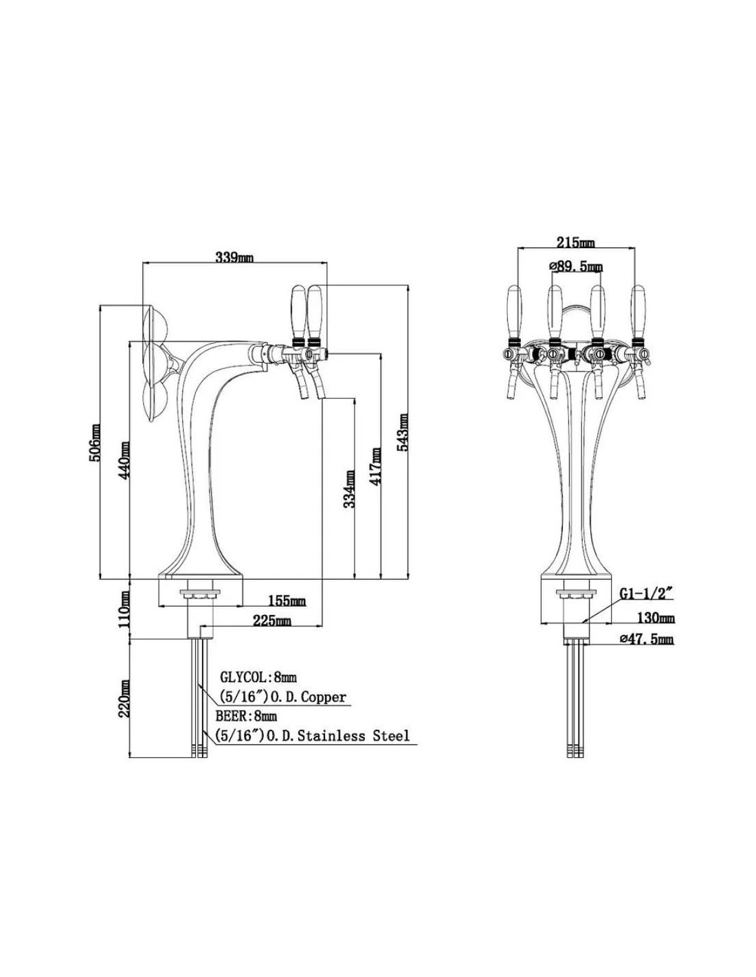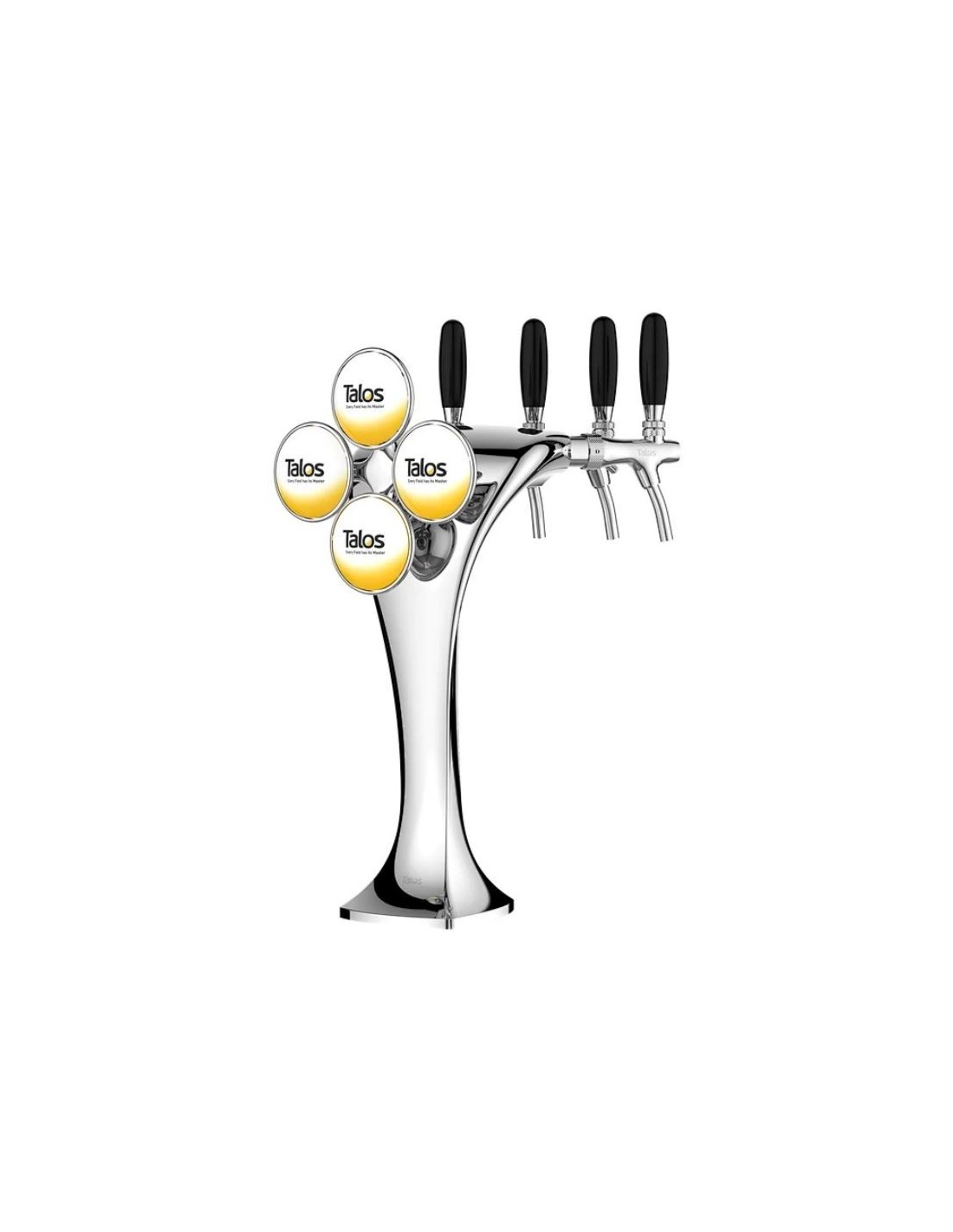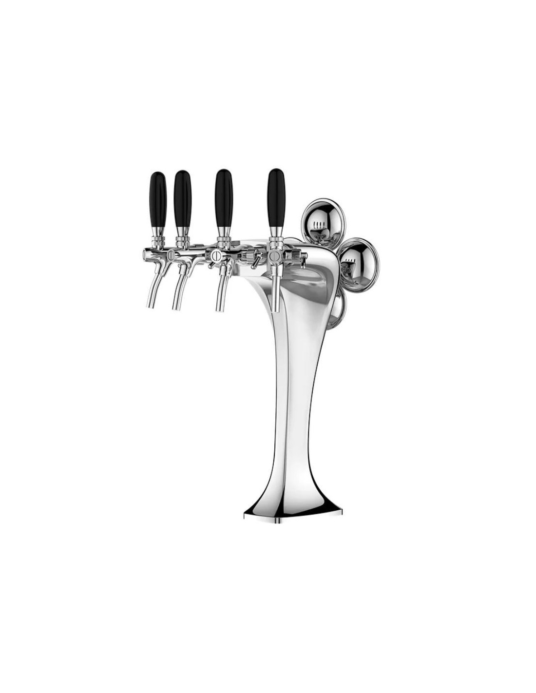 Esta torre dispensadora de cuatro salidas provista de taps con control de flujo le dan un toque de elegancia a todo bar cervecero. Está elaborada de bronce con acabado cromado y mientras que todo lo que toca la cerveza esta elaborado de acero inoxidable. Posee líneas adicionales de entrada y salida para el sistema de enfriamiento en caso de requerirlo.